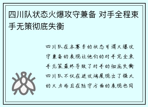 四川队在本赛季的状态可谓火爆,攻守兼备的表现让他们的对手完全束手无策,最终导致了对手的彻底失衡。四川队不仅在进攻端展现出了强大的火力,而且在防守方面的表现也同样令人惊叹。通过精准的战术布置和球员的高效执行,他们将对手压制得毫无还手之力。本文将从四川队的四个方面对他们的火爆表现进行深入分析,分别从进攻体系、防守策略、球员个人表现以及战术应变能力四个方面,详细阐述四川队如何在比赛中展现出全面的优势,令对手无可奈何,彻底陷入失衡的状态。